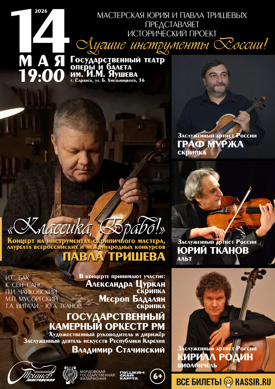 Концерт в Саранске дает старт уникальному всероссийскому проекту «Лучшие инструменты России». Это беспрецедентное событие для мировой музыкальной сцены: впервые камерный оркестр и приглашенные солисты исполнят программу исключительно на инструментах одного скрипичного мастера – Павла Тришева. Зрители услышат звучание десяти инструментов-лауреатов всероссийских и международных конкурсов и двух обладателей Гран-при России, созданных уроженцем Мордовии.