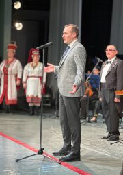 Гостей из Донбасса приветствовали величальной песней «Благопожелание. Шумбраста» артисты фольклорного ансамбля «Келу» имени Г.И. Сураева-Королёва и преподнесли мордовский каравай дирижеру мариупольского коллектива Василию Шакуле.