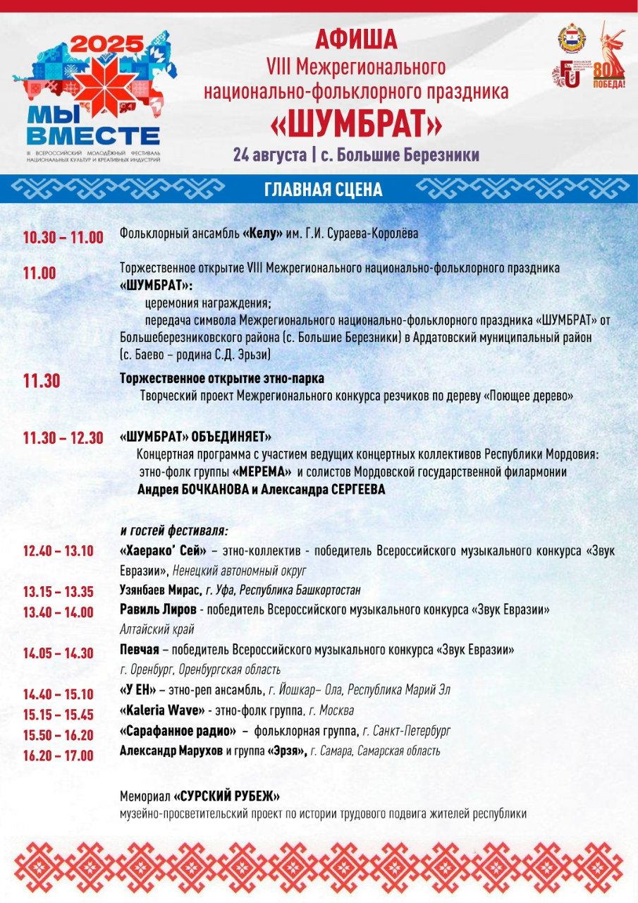 24 августа в селе Большие Березники состоится VIII Межрегиональный национально-фольклорный праздник «ШУМБРАТ». В программе праздника — торжественное открытие этно-парка, итоги межрегионального конкурса резчиков по дереву «Поющее дерево», а также концертная программа с участием ведущих концертных коллективов Республики Мордовия и гостей фестиваля.